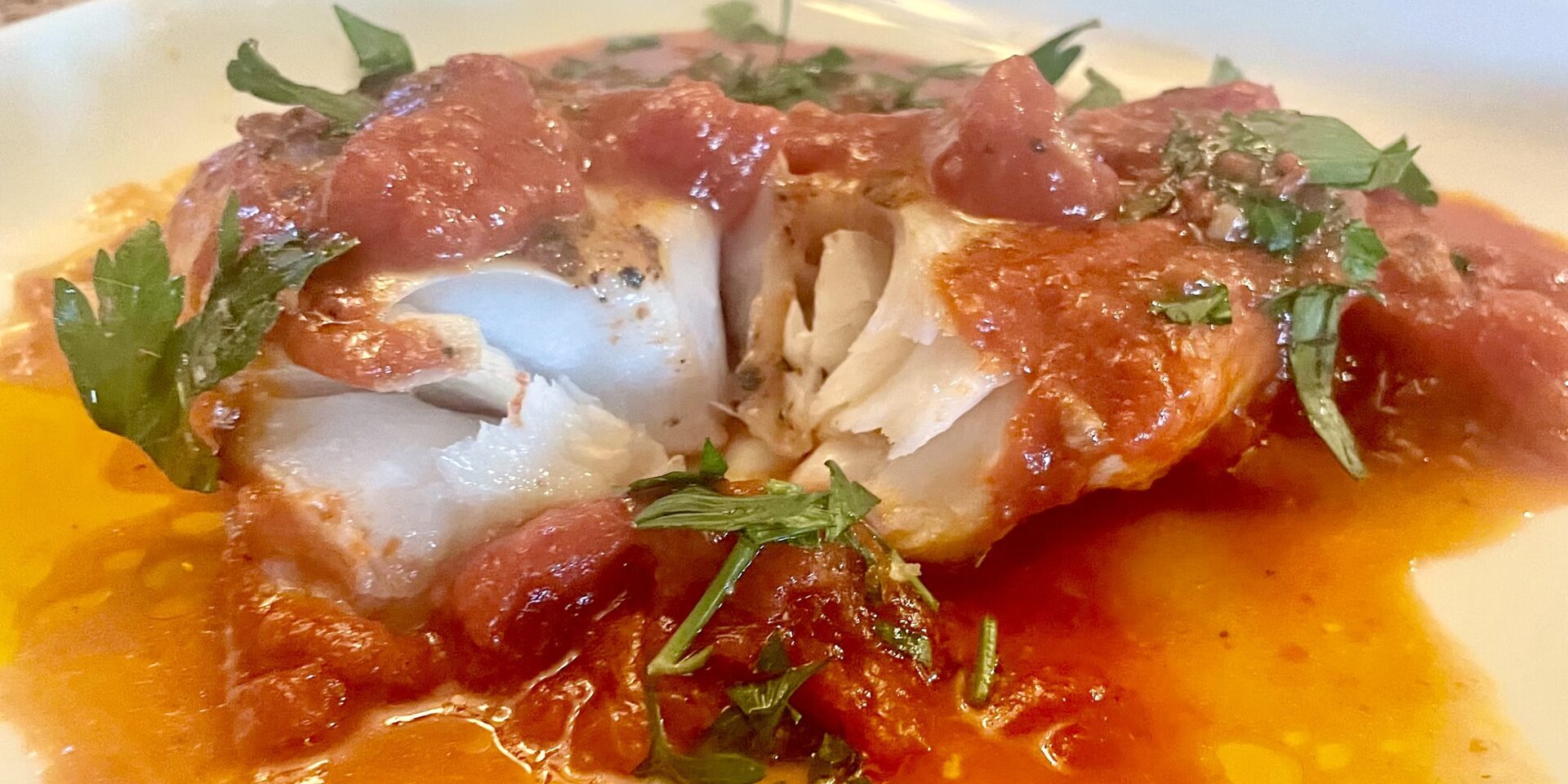 This is a hearty healthy dish that celebrates that awesome fusion of a cold water flaky and nutritious fish with a basic tomato sauce which absorbs the fish flavor in a surprisingly delicate way. It is an alternative to frying, breading and baking which in my opinion destroys not only the flavor but the texture of a great fish. MUST be fresh cod not frozen which in my opinion kills the flavor and it will taste like roof shingle. Fresh cod is a must and halibut works as well.